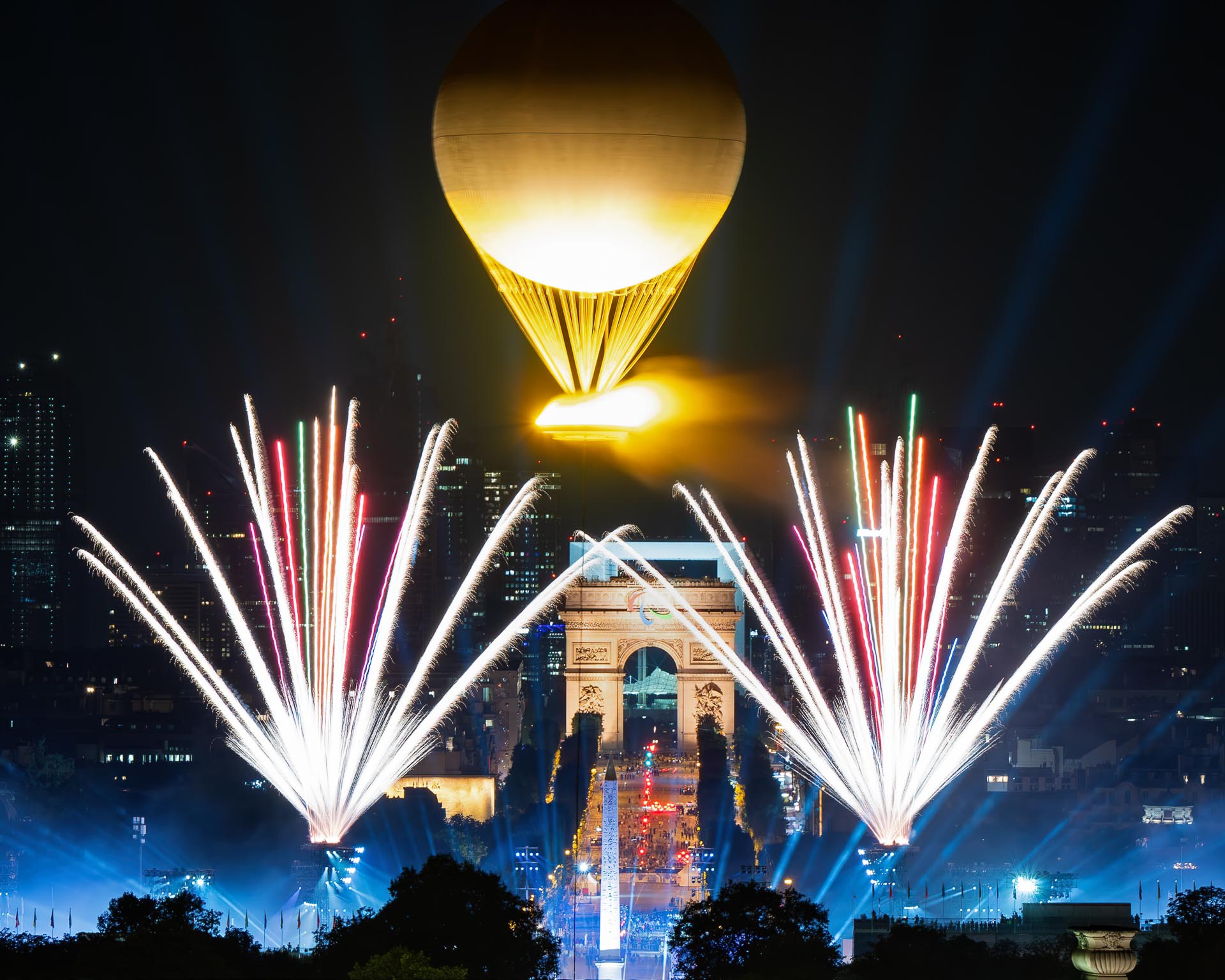 French national day in Paris at the Eiffel Tower, 1100 pyro drones and spectacular fireworks.