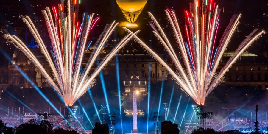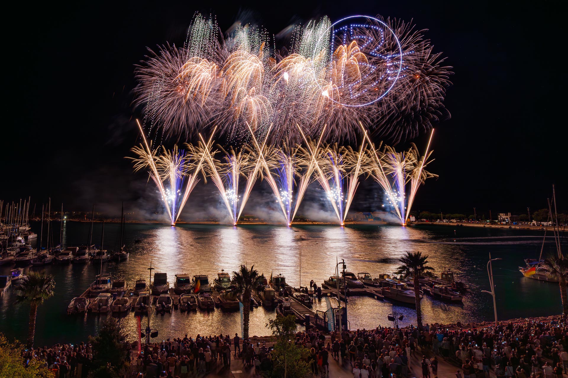 Olympic flame arrival in Marseille, night time drones and fireworks shows.